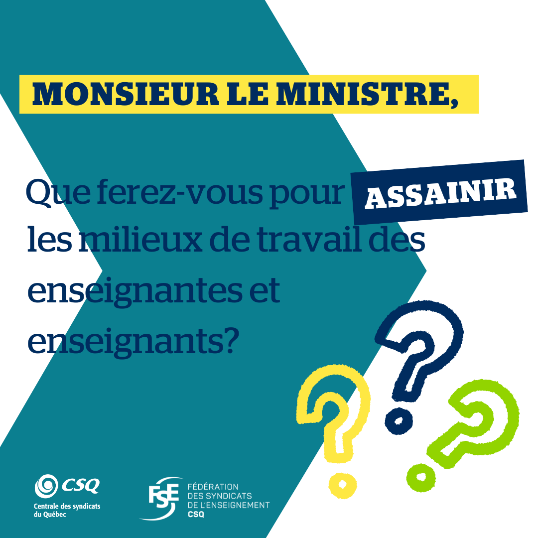 Dans le cadre de la Semaine des enseignantes et enseignants, la FSE-CSQ fera quotidiennement une publication, du 3 au 7 février, sur ses réseaux sociaux en lien avec des sujets qui retiennent l’attention du personnel enseignant afin de rappeler au ministre de l’Éducation que les encouragements, c’est bien, mais que les gestes concrets c’est mieux.