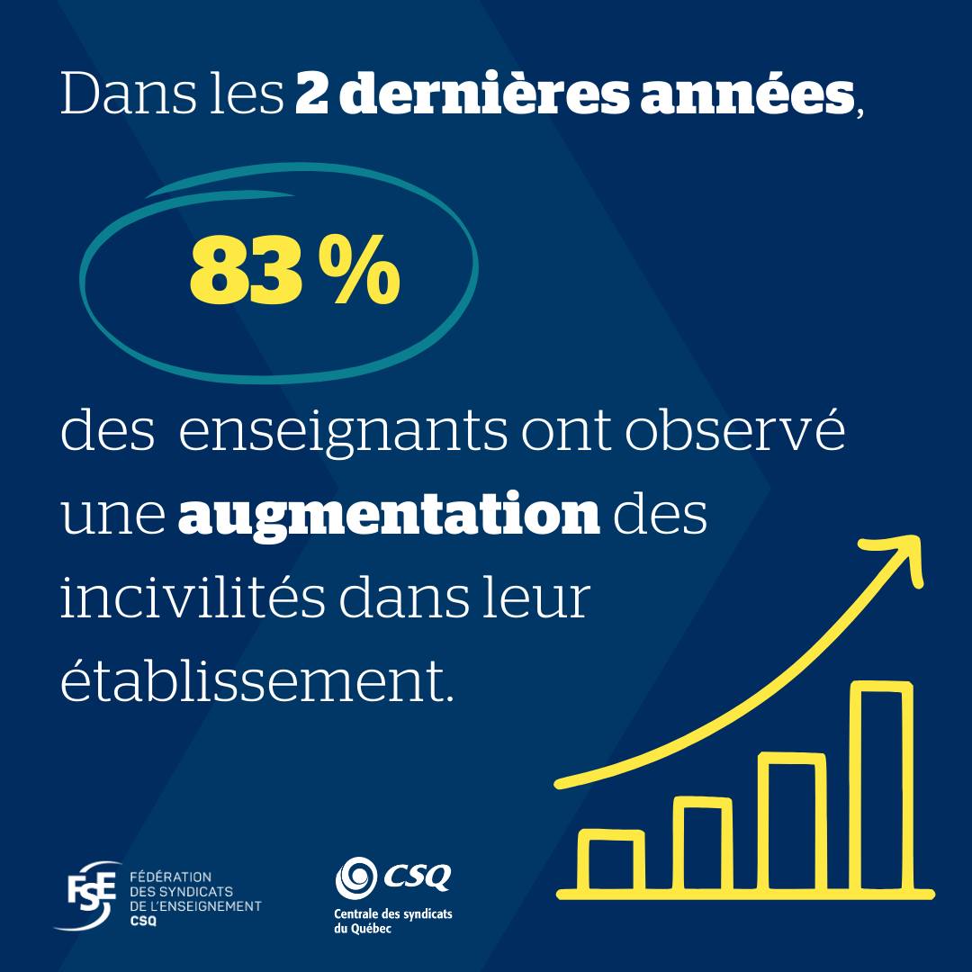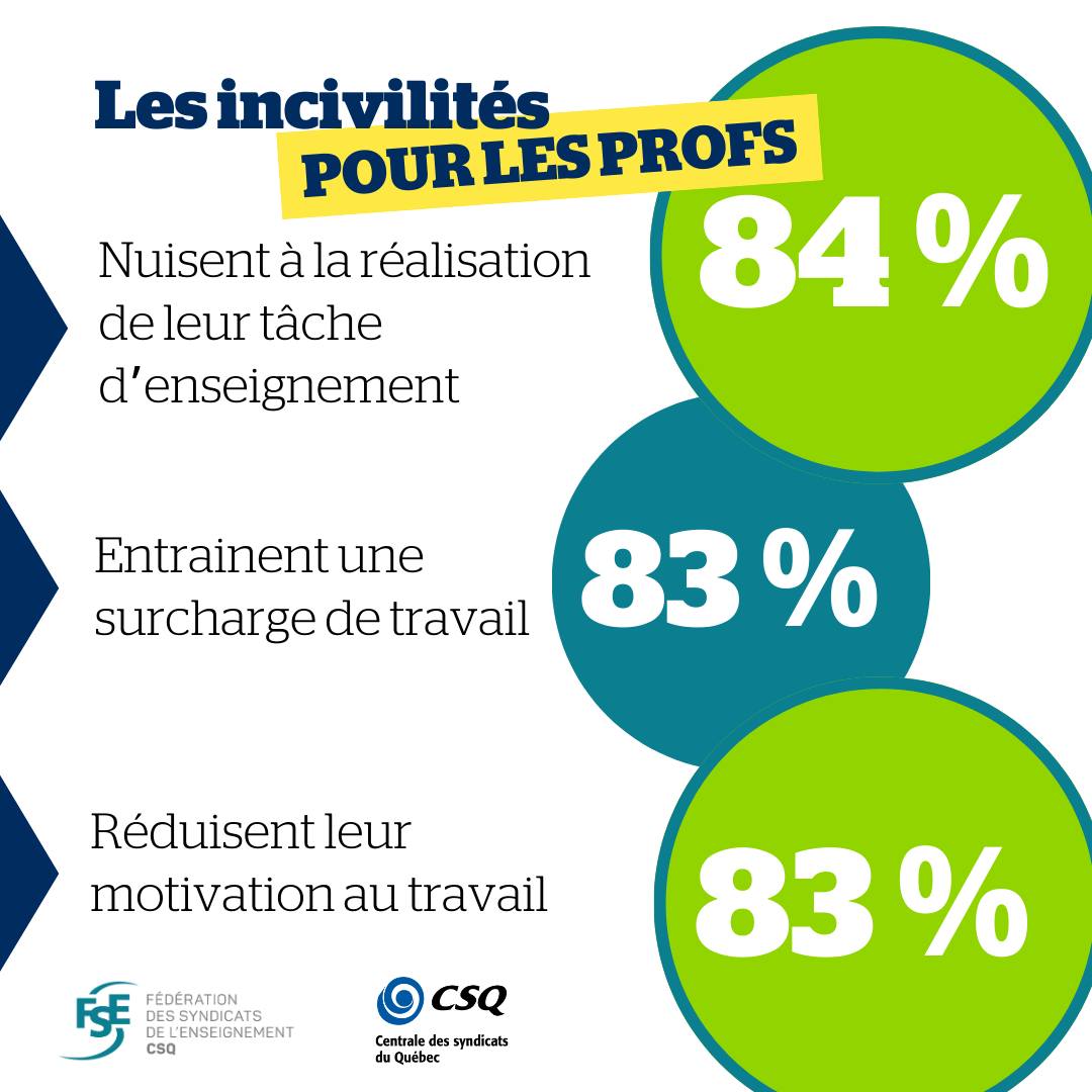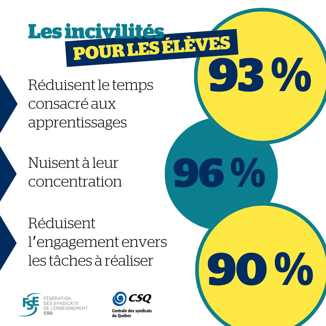« Contrer les incivilités en milieu scolaire, c’est contribuer à un climat sain dans nos écoles et c’est donner plus de temps de qualité aux profs pour enseigner en améliorant les conditions d’apprentissage des élèves. Bien que les données obtenues dans une consultation tenue l’automne dernier soient alarmantes et que le ministre se soit montré sensible à la problématique, les enseignantes et enseignants sont toujours en attente de son plan », a mentionné Richard Bergevin, président de la FSE-CSQ, tout en rappelant que 84 % des personnes consultées mentionnent qu’elles nuisent à l’accomplissement de leur tâche d’enseignement.