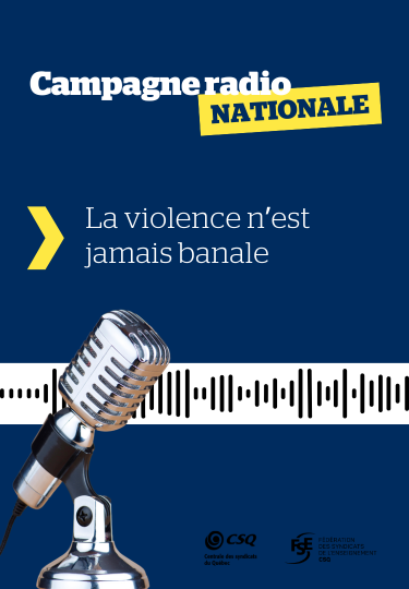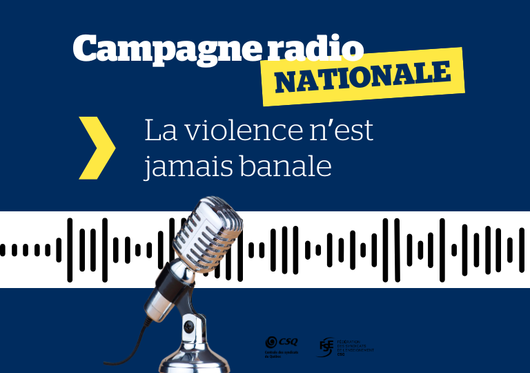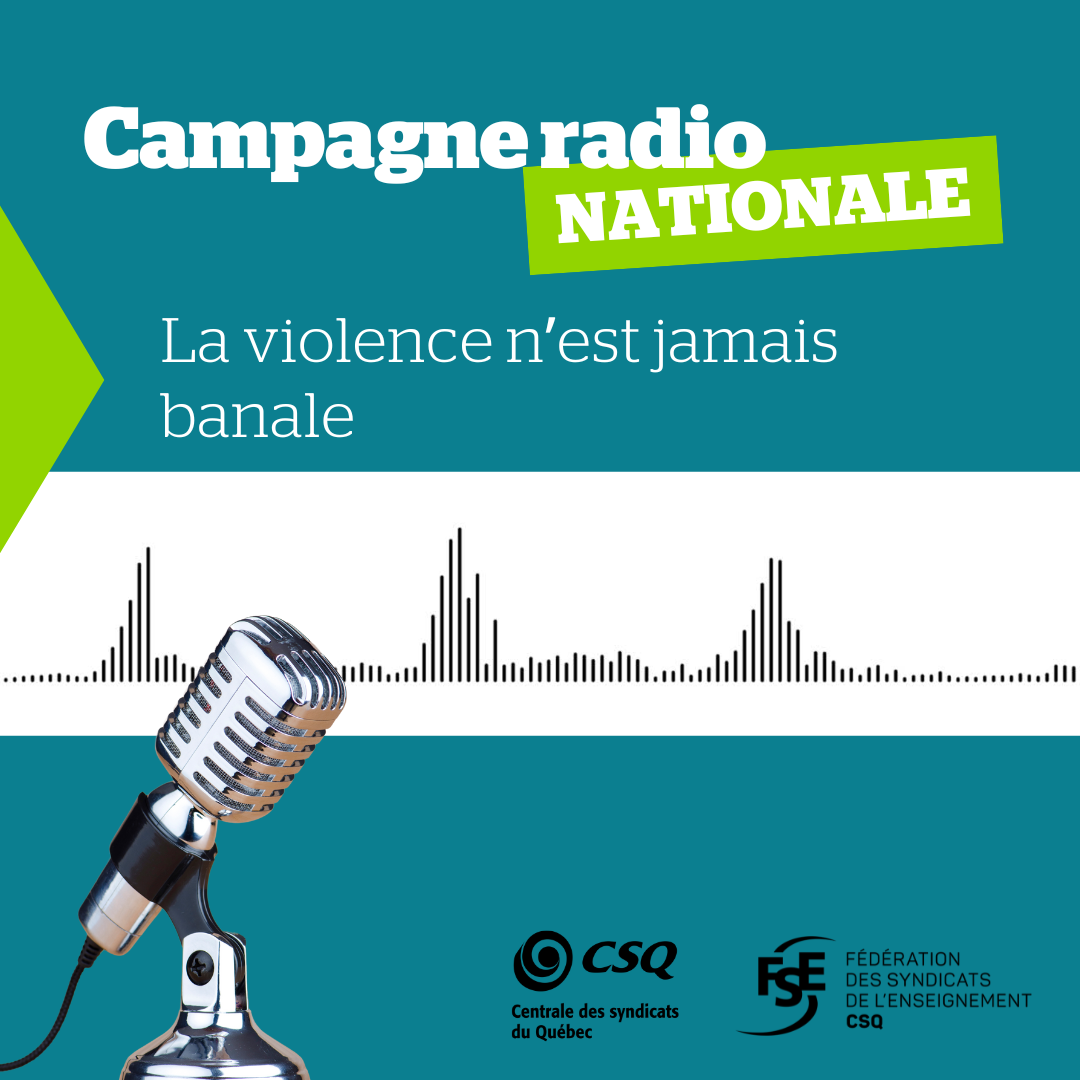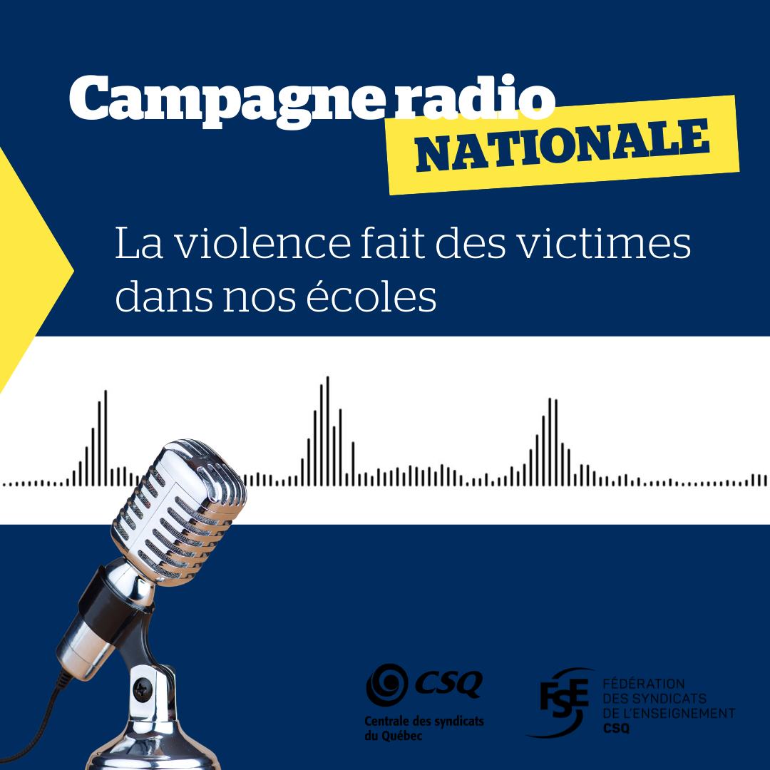Dans le cadre de la Semaine de la prévention de la violence et de l’intimidation dans les écoles, mise de l’avant par le ministère de l’Éducation du Québec, la Fédération des syndicats de l’enseignement (FSE-CSQ) lance une campagne publicitaire à la radio pour sensibiliser la population à la problématique de la violence et des incivilités en milieu scolaire à l’endroit du personnel enseignant. Celle-ci débute aujourd’hui et sera diffusée aux quatre coins du Québec pendant deux semaines.