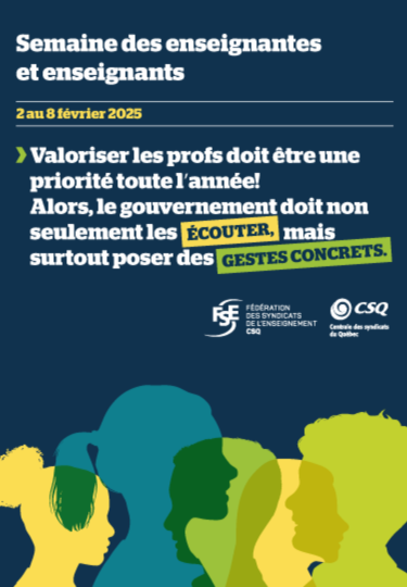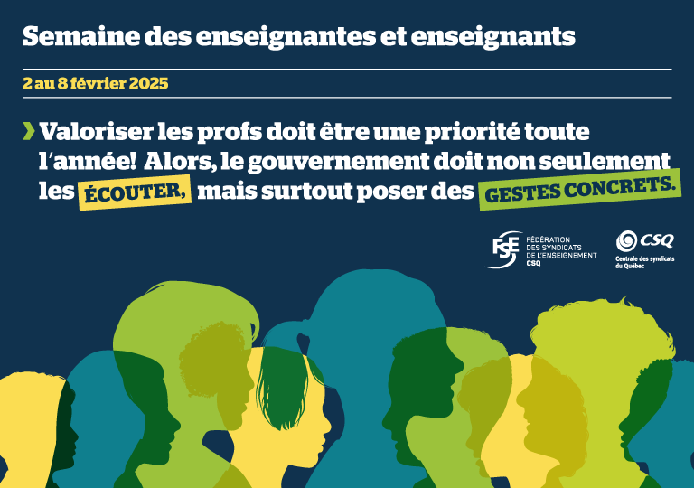 Dans le cadre de la Semaine des enseignantes et des enseignants qui se déroulera du 2 au 8 février 2025, la Fédération des syndicats de l’enseignement (FSE-CSQ) souligne le travail remarquable et l’engagement quotidien du personnel enseignant. On ne le dira jamais assez, les profs font une différence positive fondamentale dans le parcours des élèves québécois, et ce, malgré des conditions qui ne sont pas toujours faciles. La FSE-CSQ en profite pour rappeler au gouvernement qu’au-delà des encouragements et des bons mots, ce sont surtout les actions concrètes qui permettent de valoriser les enseignantes et enseignants.