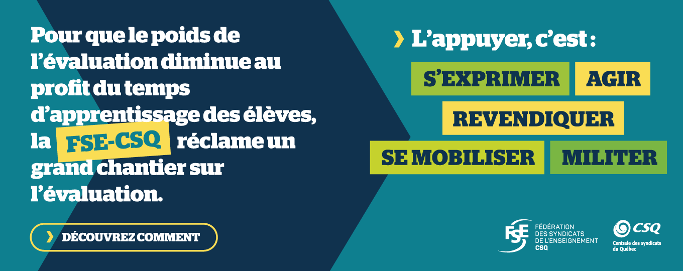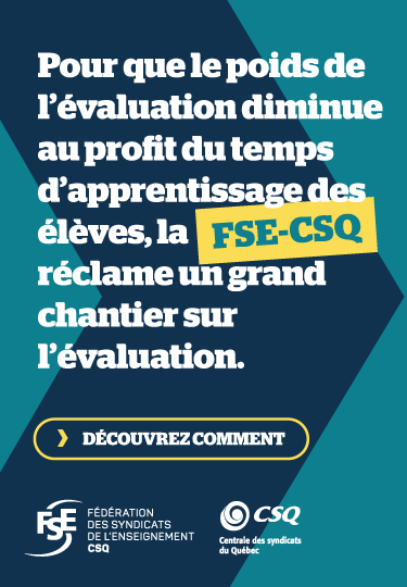 La FSE-CSQ s’assurera d’impliquer les enseignantes et enseignants et de porter leurs préoccupations sur toutes les tribunes. Au moment opportun, la Fédération consultera ses membres sur les améliorations souhaitées et les propositions à mettre de l’avant en évaluation des apprentissages, par exemple, les résultats à produire au bulletin, l’évaluation à la formation générale des adultes (FGA) et à la formation professionnelle (FP) ou les enjeux en évaluation pour les élèves autochtones (Cris, Inuit et Naskapis).